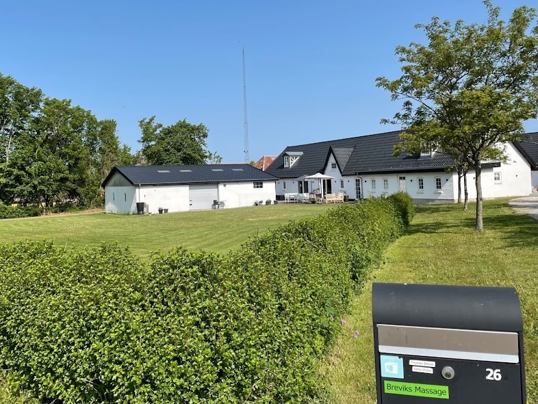 Klinikken er beliggende i rolige omgivelser i Hasselager. Bemærk, at indgangen er via den hvide bygning, som du ser her på billedet.